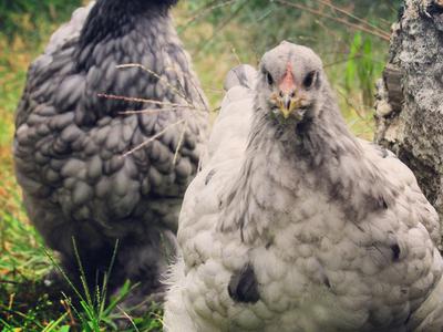 They had been raised on a chicken farm and had never seen grass. When we brought then home they kept high-stepping like they didn't understand what they we're walking on. Both were very docile and friendly.