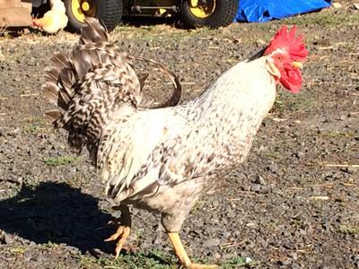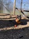 They were both wonderful birds. Goose was a goofy rooster, and incredibly loud. He was a gentleman towards Morticia, and was popular with the hens. He had horrible eyesight, but he did everything he could to protect Morticia. I later learned that he seemed to be a Barred Rock/Americana mix.