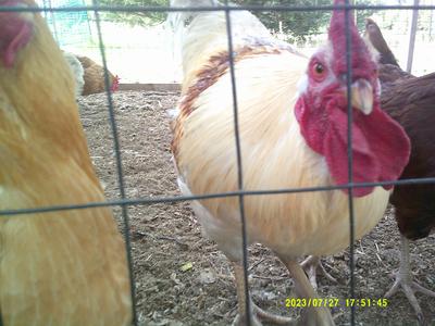 We have an Isa brown rooster named Marshmallow. He is creamy white with attractive brown bars on his wings and back. He is a little aggressive, but he sure does his job well.